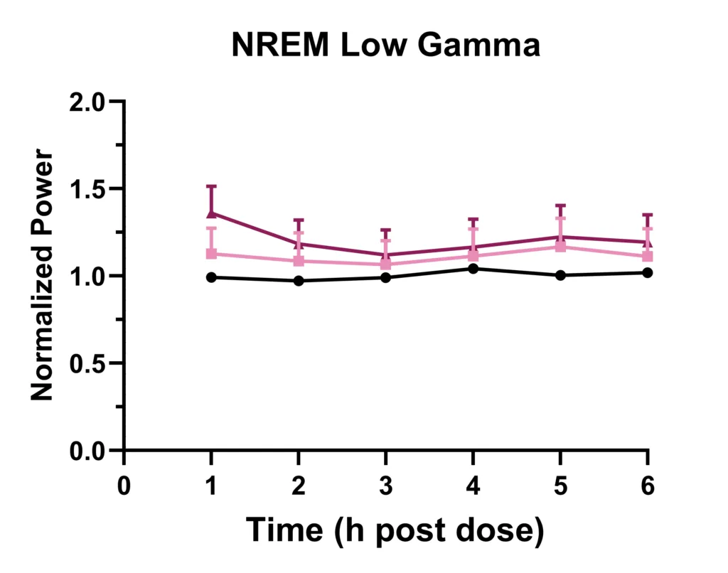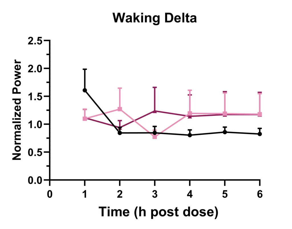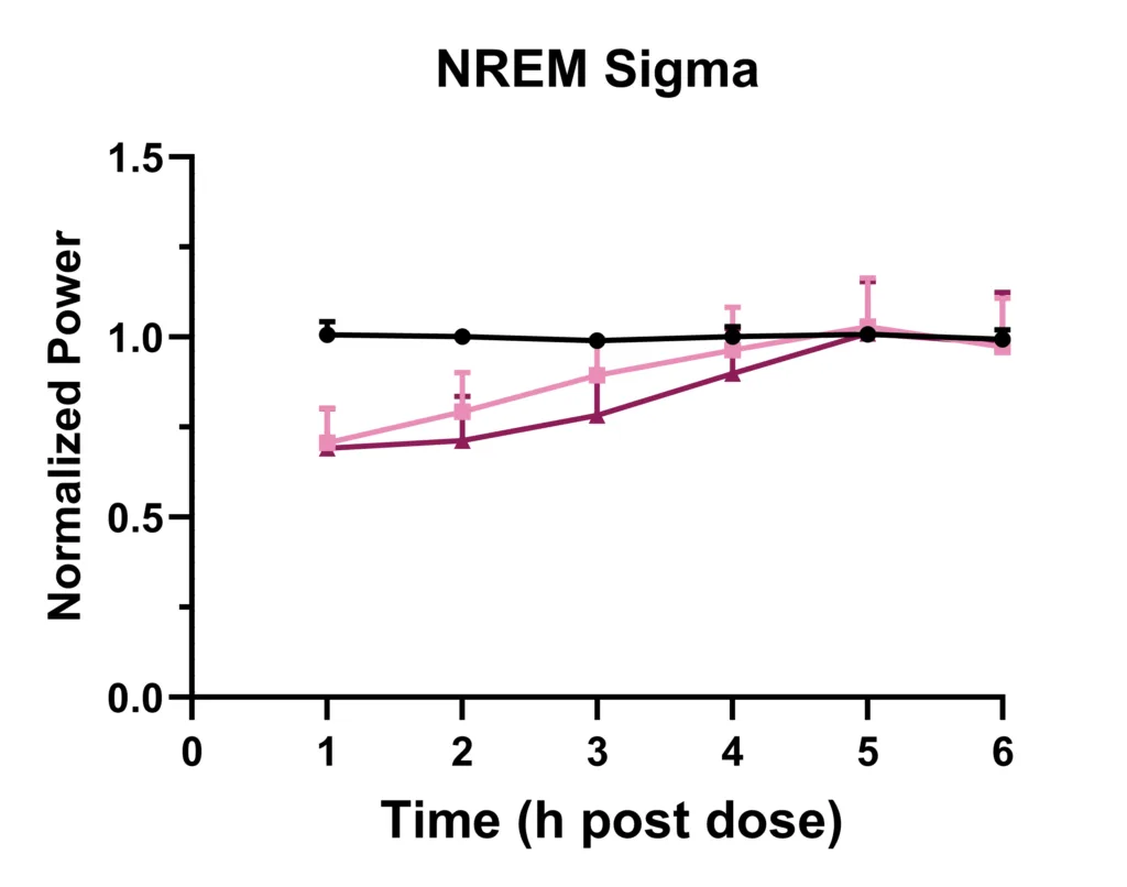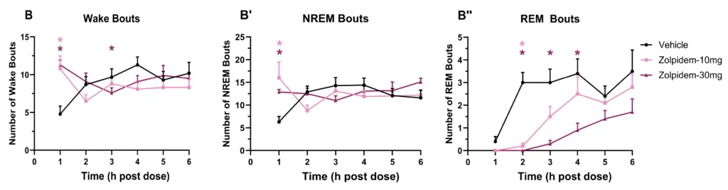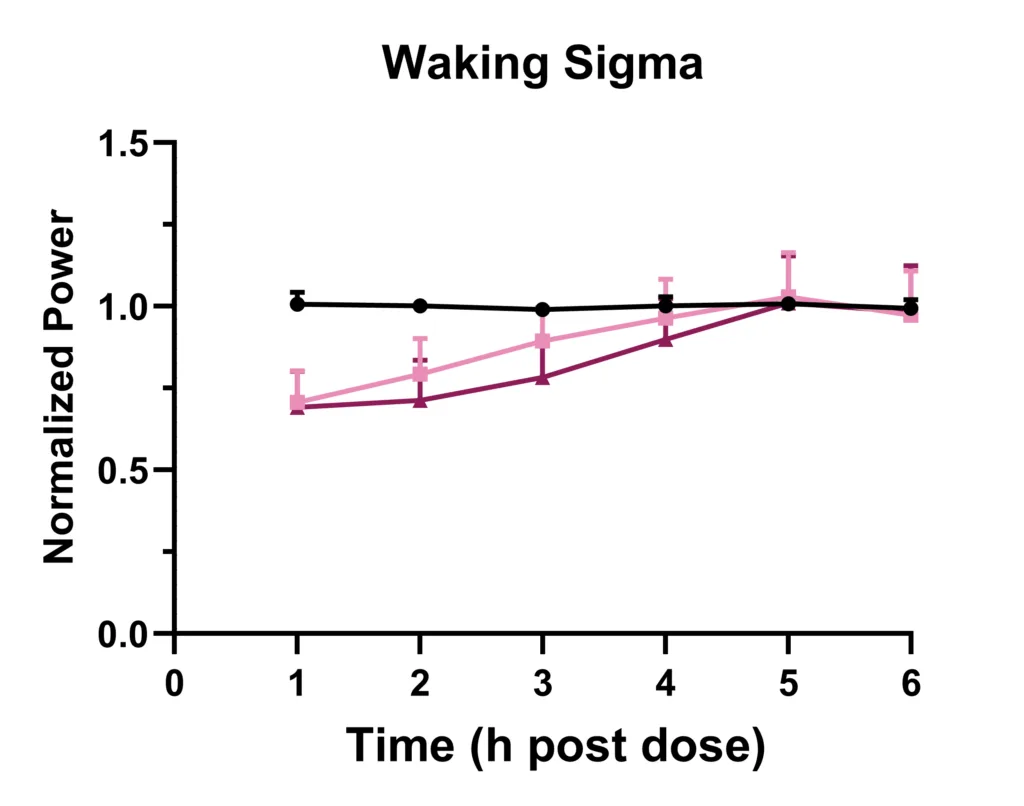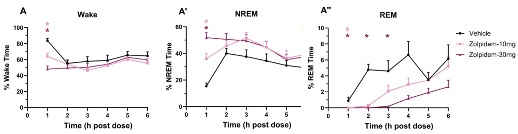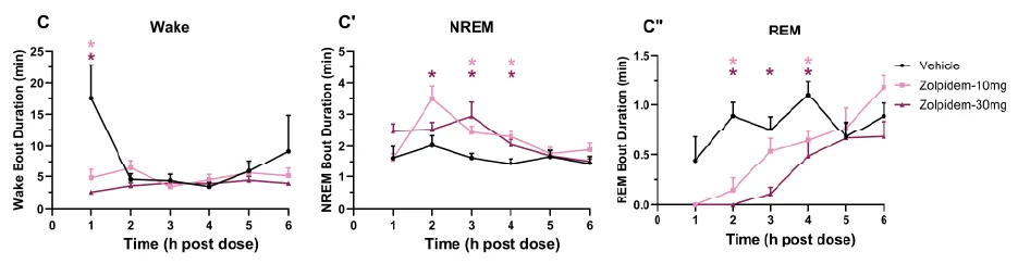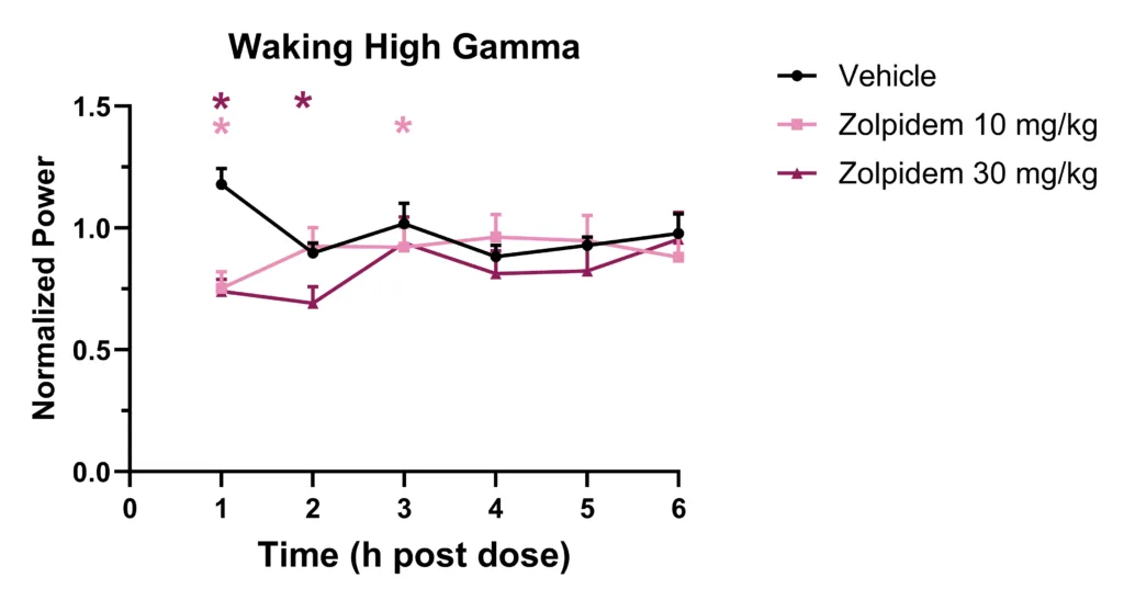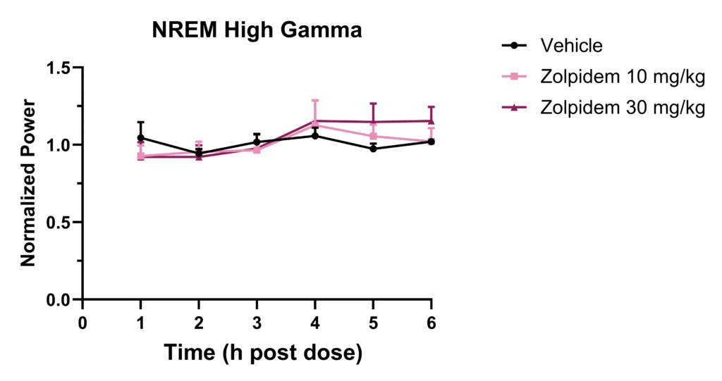 PsychoGenics has deep knowledge of sleep/wake analyses and provides the highest quality EEG data. A full characterization of EEG patterns includes sleep/wake analyses, careful artifact removal for high quality power analyses, spectral power density analyses within each state, and a characterization of any aberrant EEG waveforms such as unusual spiking or seizure activity. These careful analyses provides the best opportunity for finding EEG biomarkers that are translational to the clinic. Below are example data on zolpidem, a standard sleep-promoting compound.