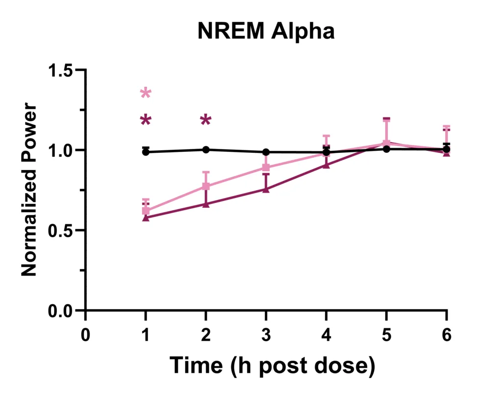 Figure 4.  Analysis of the NREM spectrum following zolpidem shows overall treatment effects of increased power in delta and low gamma and decreased power for alpha and sigma mostly following the 30 mg/kg dose.  Significant hourly data are designated by color-coded asterisk above the data points. These data suggest that the sleep experienced following zolpidem may not be physiologically the same as natural sleep.