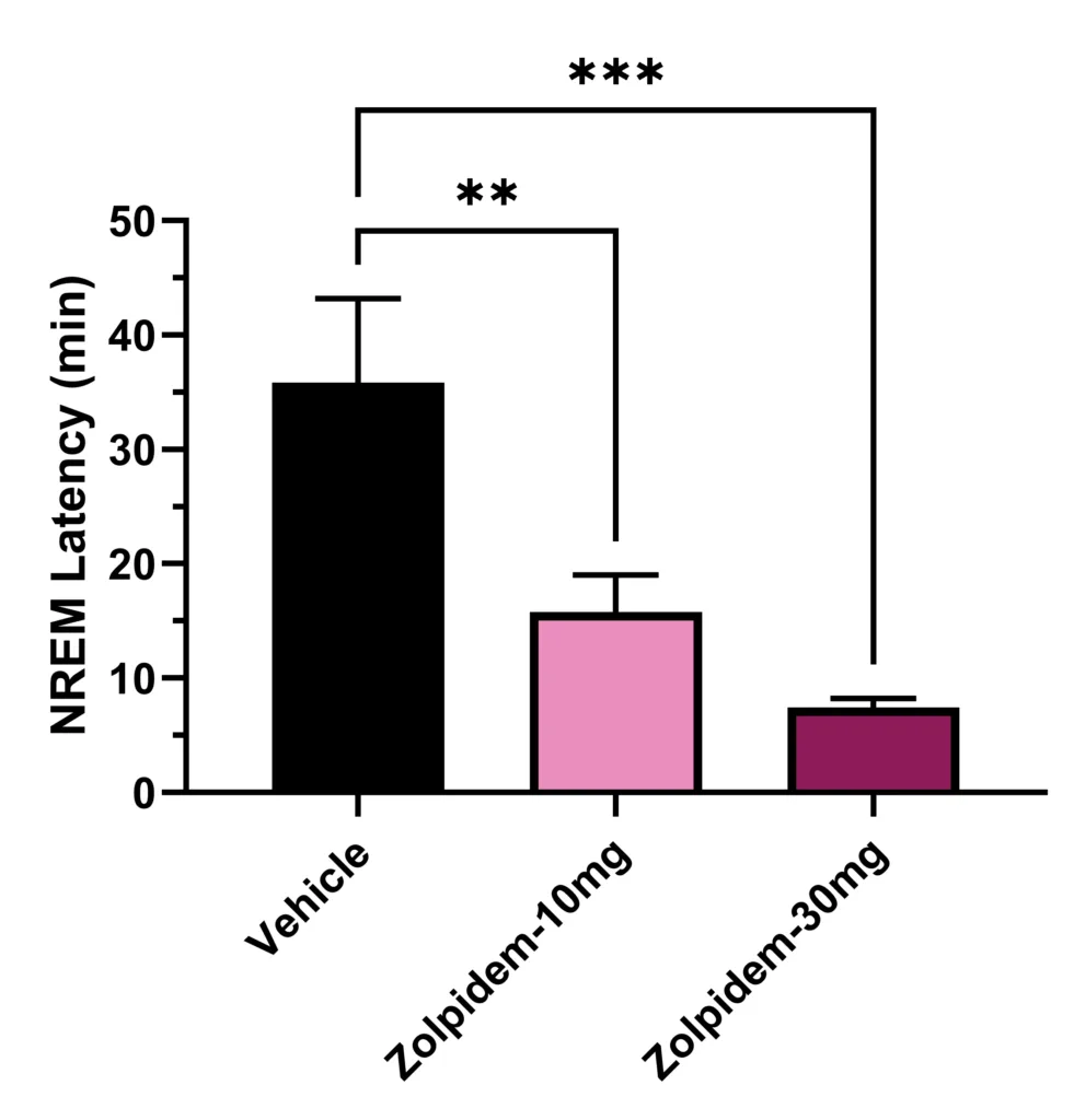 PsychoGenics has deep knowledge of sleep/wake analyses and provides the highest quality EEG data. A full characterization of EEG patterns includes sleep/wake analyses, careful artifact removal for high quality power analyses, spectral power density analyses within each state, and a characterization of any aberrant EEG waveforms such as unusual spiking or seizure activity. These careful analyses provides the best opportunity for finding EEG biomarkers that are translational to the clinic. Below are example data on zolpidem, a standard sleep-promoting compound.