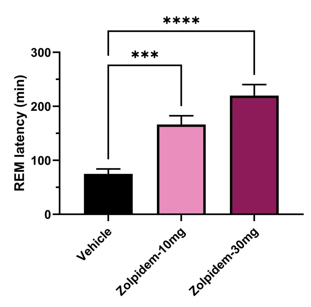 Figure 1. The effects of Zolpidem on the latency to the onset of NREM and REM sleep. Rats were administered Zolpidem (10 and 30 mg/kg) during dark phase (ZT17). Zolpidem decreased the onset to NREM and increased the latency to REM in a dose-related manner.
