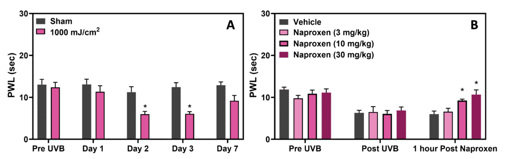 In rats, UVB irradiation of the plantar surface of the hind paw results in erythema and pain behaviors measured as hypersensitivity to a noxious heat stimulus using the Hargreaves test. The pain response is maximal on Days 2 and 3 following irradiation and persists through Day 7. NSAIDs such as naproxen alleviate the UVB-induced pain response.